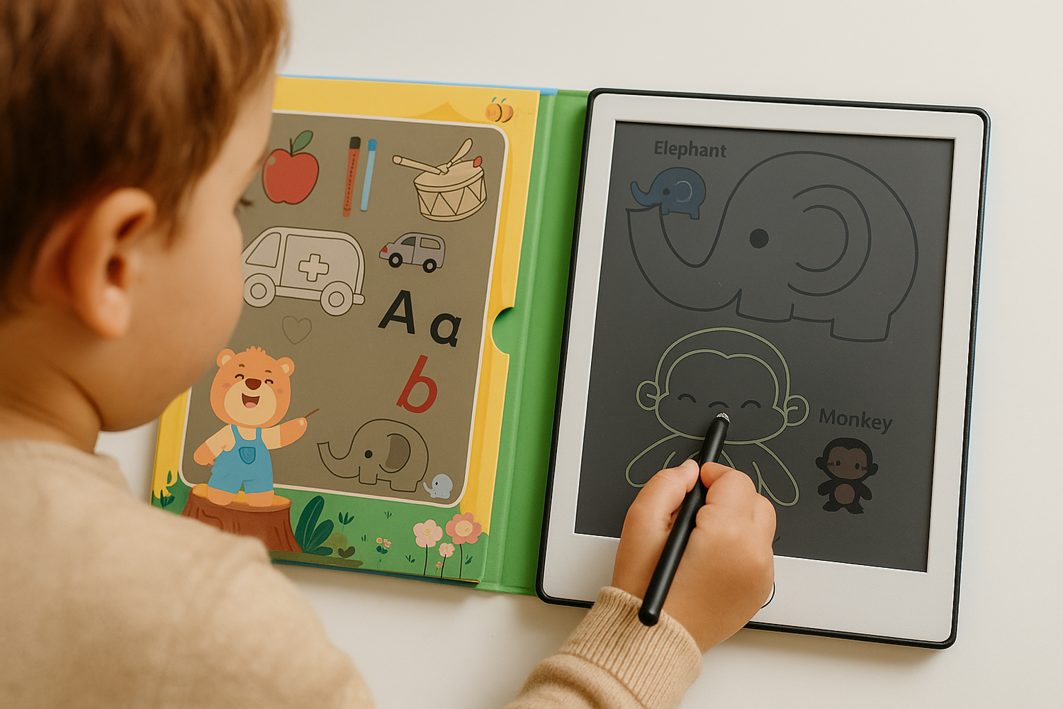 Barnet följer linjerna med pennan och kan radera med ett knapptryck för att börja om.
